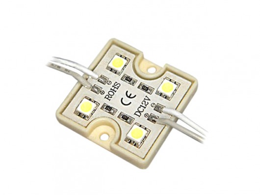 Квадратный светодиодный модуль PS 5050-4 IP65 5760Lm это 4 диода SMD 5050 и резисторы с рабочим напряжением 12V, которые находятся в пластиковом корпусе. Яркость 1 диода составляет 72Lm, а всей упаковки — 5760Lm, что дает вам очень яркое и насыщенное свечение. Корпус залит двухкомпонентным компаундом. Поэтому вы можете использовать светодиодный модуль led в условиях  повышенной влажности и резкого перепада внешней температуры от  -30 до +50 градусов.