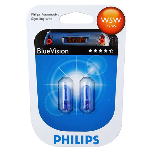 Philips 12V 5W BlueVision W5W — это галогеновая лампа с цоколем Т10, которая излучает белый свет с голубым оттенком. И именно голубое покрытие автолампы BlueVision W5W создает эффект дневного света, схожий со свечением ксенона. При этом большой срок службы данной галогенки обеспечивает яркое свечение круглые сутки.