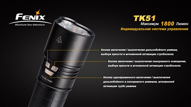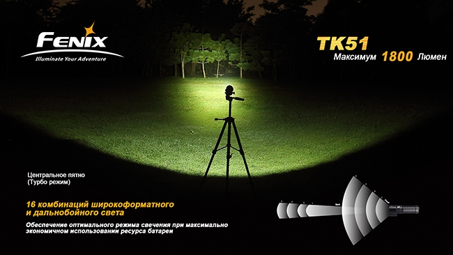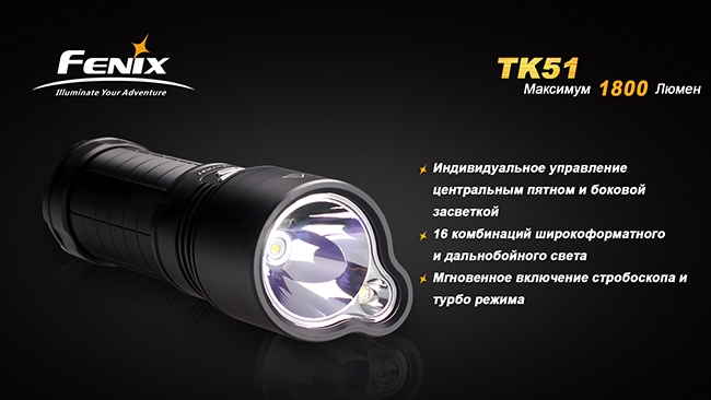 Поисковый фонарь Fenix TK51 — практически идеальная модель для тех, кому нужно широкоформатное освещение, чтобы фонарь одинаково хорошо освещал предметы и вдали и вблизи. Благодаря двум независимым светодиодам универсальный фонарь может комбинировать дальний яркий свет с боковой засветкой. Всё это делает модель хитом продаж.