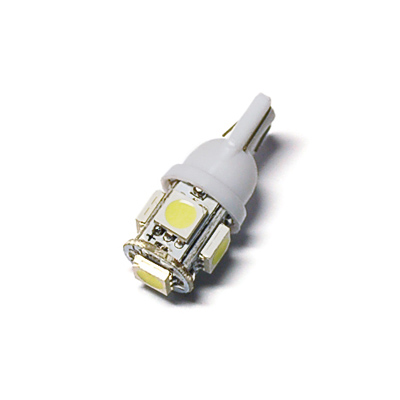 Светодиодная лампа T10 5SMD - это ультраяркая бесцокольная лампа объёмного света, построенная на базе сверхъярких SMD диодов, 4 из которых светят по окружности лампы, а один -  вперед.  Лампа светит ярким белым светом. Температура цвета - 5000K . Предназначена для установки в передние габариты, хотя может быть использована и для подсветки салона или номерного знака. . Яркость составляет 100 Люмен.