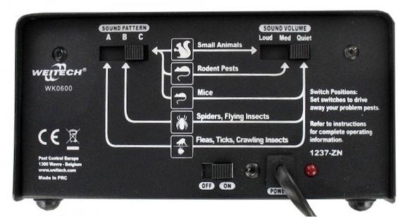 Устройство имеет 9 режимов работы.  Подбирайте наиболее оптимальную частоту и мощность излучения для отпугивания конкретных вредителей. Для этого сзади прибора имеется два переключателя — "Громкость звукового излучения" (Sound volume) и "Звуковой рисунок" (Sound pattern). Каждый из них имеет 3 положения, комбинируя которые, можно выбрать один из девяти режимов.