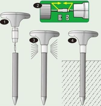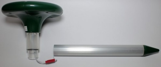 Специальная форма прибора позволяет легко и просто устанавливать его в почву. Встроенный генератор через излучатель посылает сигналы определенной частоты, которые заставляют кротов и грызунов в панике покидать обжитые места в радиусе до 700 м2. Это может занять до нескольких недель при постоянном применении отпугивателя.