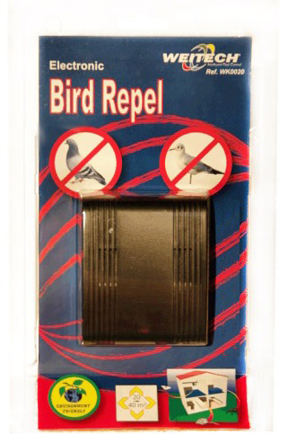 Отпугиватель птиц Weitech WK-0020 — эффективный прибор для отпугивания птиц маленького и среднего размера (голуби, вороны, воробьи и т.д.) с помощью ультразвука. Используется для защиты балконов, мансард, чердаков и подобных мест площадью до 40 м2, "обжитых" пернатыми гостями. Ультразвук не наносит вреда птицам, а лишь вызывает у них страх и желание покинуть место распространения сигнала.