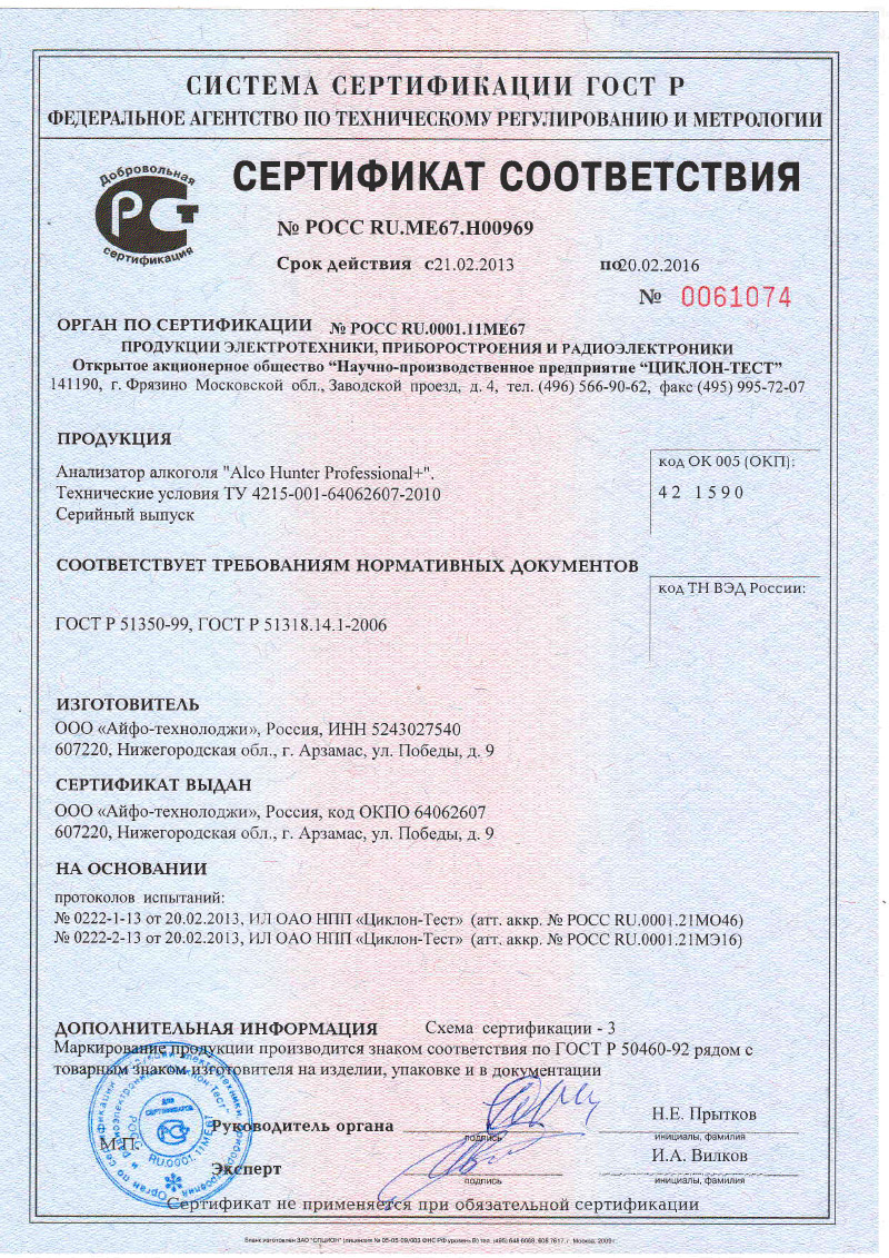 Перед началом измерения алкометр AlcoHunter Professional автоматически производит тестирование датчика. Если будет обнаружено, что датчик нуждается в калибровке, устройсто напишет соответствующую надпись на графическом дисплее. Таким образом, вы всегда будете уверены в точности и надежности показаний алкотестер. При этом можно сразу произвести самокалибровку алкотестера. Алкотестер может сам откалибровать датчик по трезвому выдоху. Также возможен второй тип калибровки с применением генератора спирто-воздушных смесей.