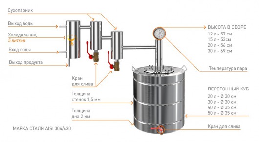 Это небольшое устройство подходит для домашнего использования. Работа с ним не требует дополнительных навыков или сложного обучения. Достаточно залить брагу и поставить аппарат на плиту.