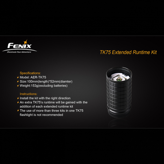 Дополнительная секция корпуса с кодом AER-ТК75 подходит для таких моделей фонарей Fenix, как ТК61, ТК75, ТК76. В комплект к ней входит кассета для установки элементов питания: четыре штуки формата 18650. Увеличение количества аккумуляторов, в свою очередь, продлевает время непрерывной работы фонаря. Этот параметр может быть чрезвычайно важным во время проведения поисково-спасательных работ, позволяя дольше пользоваться ярким светом.