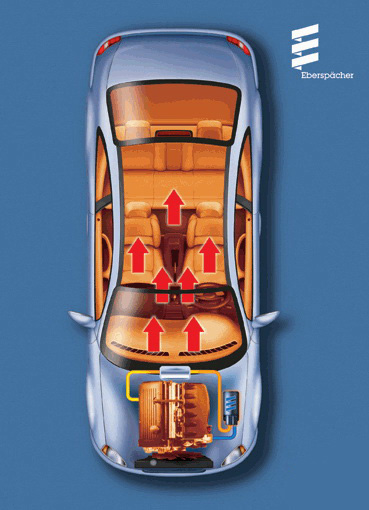 Прибор устанавливается в пространство системы циркуляции теплоносителя от двигателя. Тепловая энергия выходит из обменника автомобиля и распределяется по салону. То тепло, которое остается, используется для того, чтобы подогреть охлаждающую жидкость двигателя.