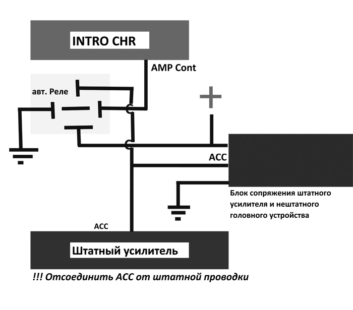 При возникновении щелчков в динамиках в момент вкл/выкл магнитолы, подключить реле в соответствии с схемой по подключению к штатному усилителю Toyota: