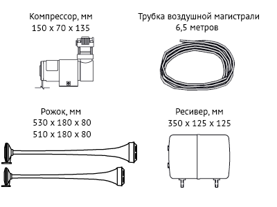 Комплект KIT 984 это ярковыраженный бас на службе Вашего автомобиля. Вы можете разместить устройство под капотом или снаружи авто — на свое усмотрение. Основные запчасти можно расположить в разных частях машины: рожок, конечно же, ставится в передней части машины, а вот ресивер и компрессор — в багажнике либо салоне (если нет места в моторном отсеке).