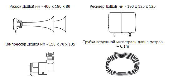 Комплект KIT 964 — это ярковыраженный бас на службе Вашего автомобиля. Вы можете разместить устройство под капотом или снаружи автомобиля на свое усмотрение. Основные запчасти можно расположить в разных частях машины: рожок, конечно же, ставится в передней части машины, а вот ресивер и компрессор — в багажнике либо салоне (если нет места в моторном отсеке).